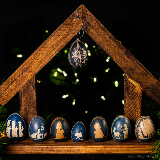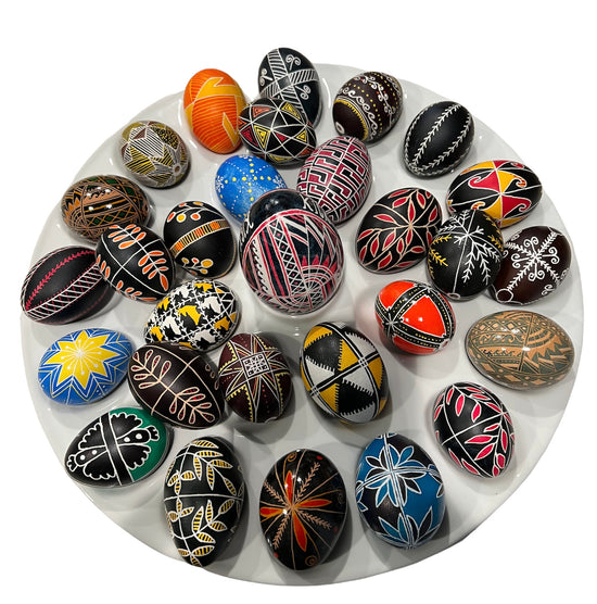 Here you will find a variety of handmade egg ornaments and egg art all made using a wax resist method. This method uses wax and dyes to create the art on real egg shells. These are sometimes known as Pysanky or more commonly "Ukrainian Easter Eggs".