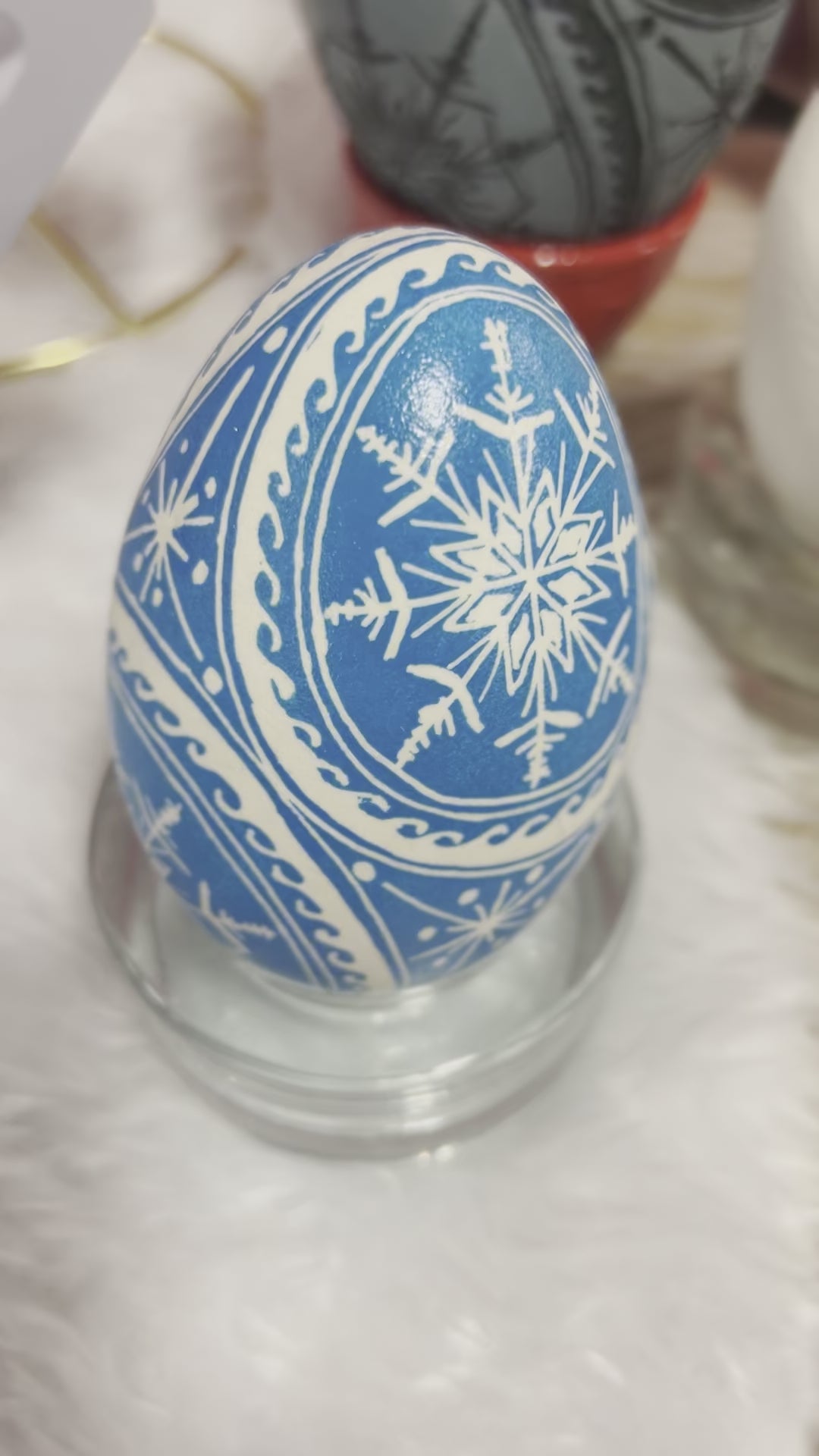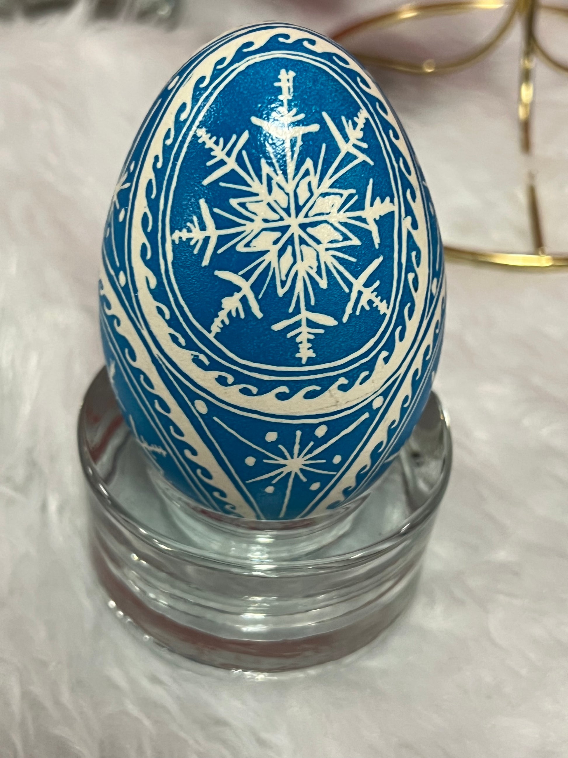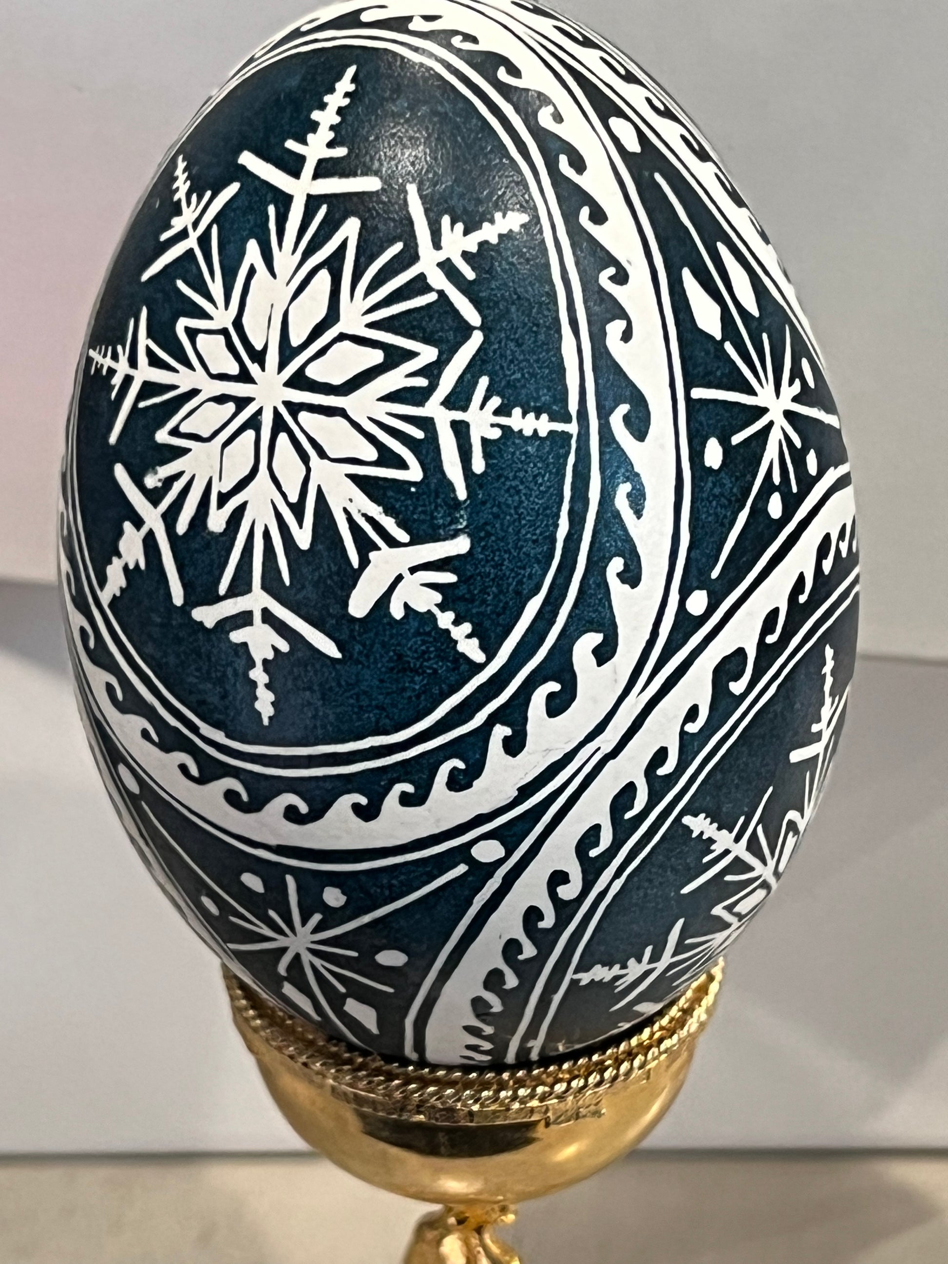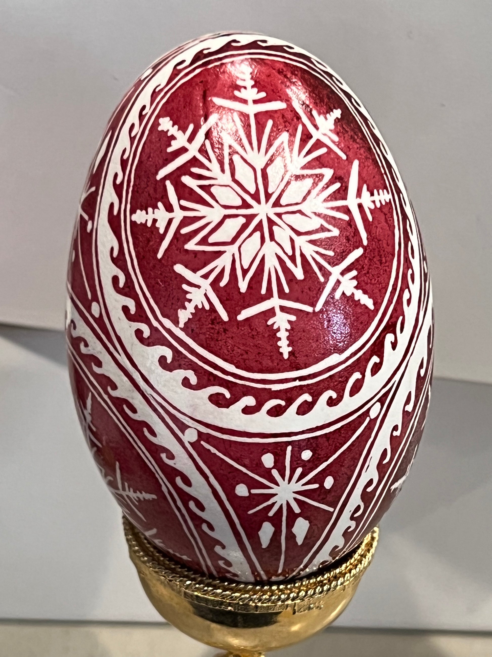 A simple yet elegant design with snowflakes nesting inside 4 circles on a goose egg. The base white color of the goose egg jumps out from the rich background color (typically a blue or red).