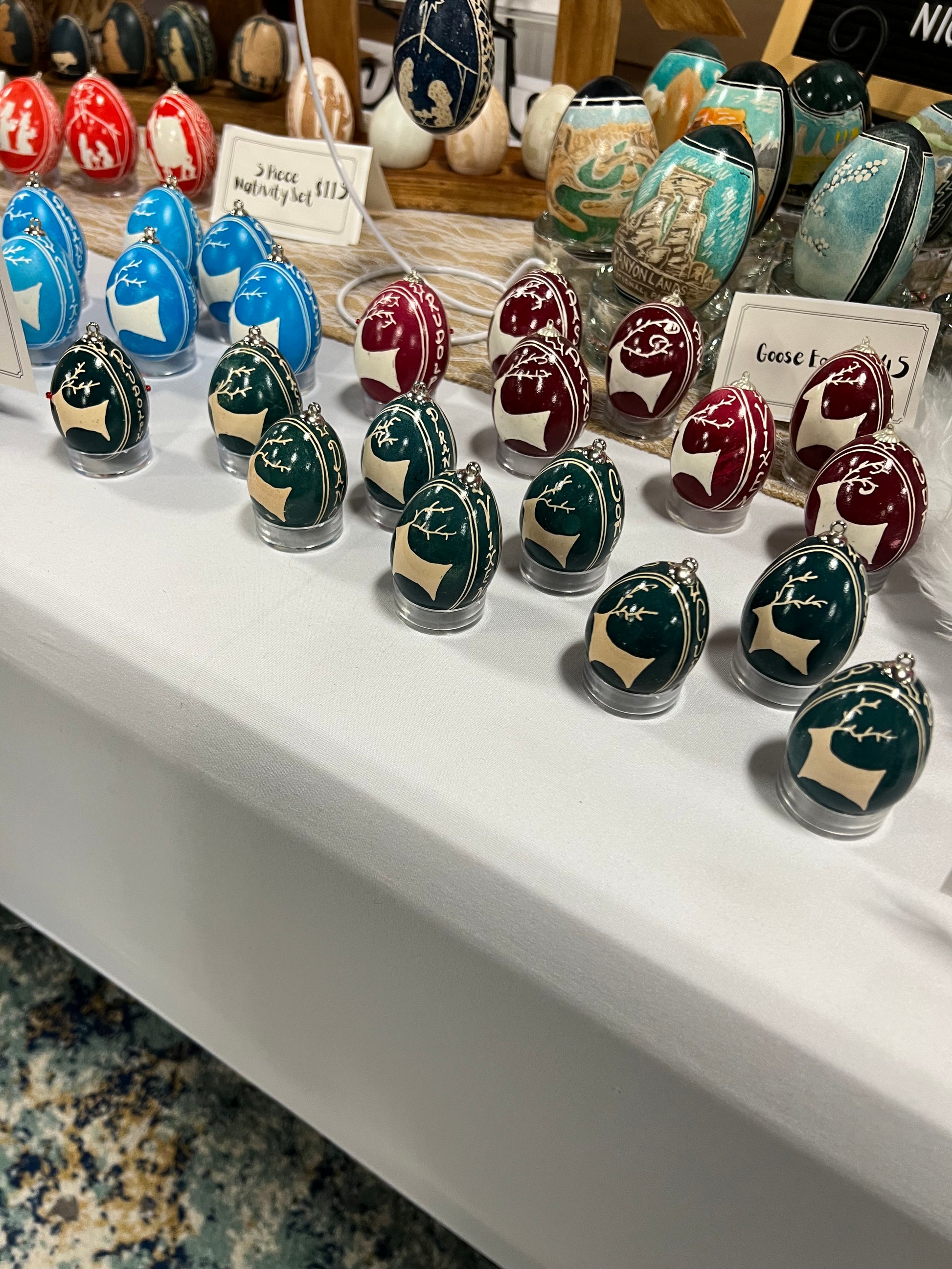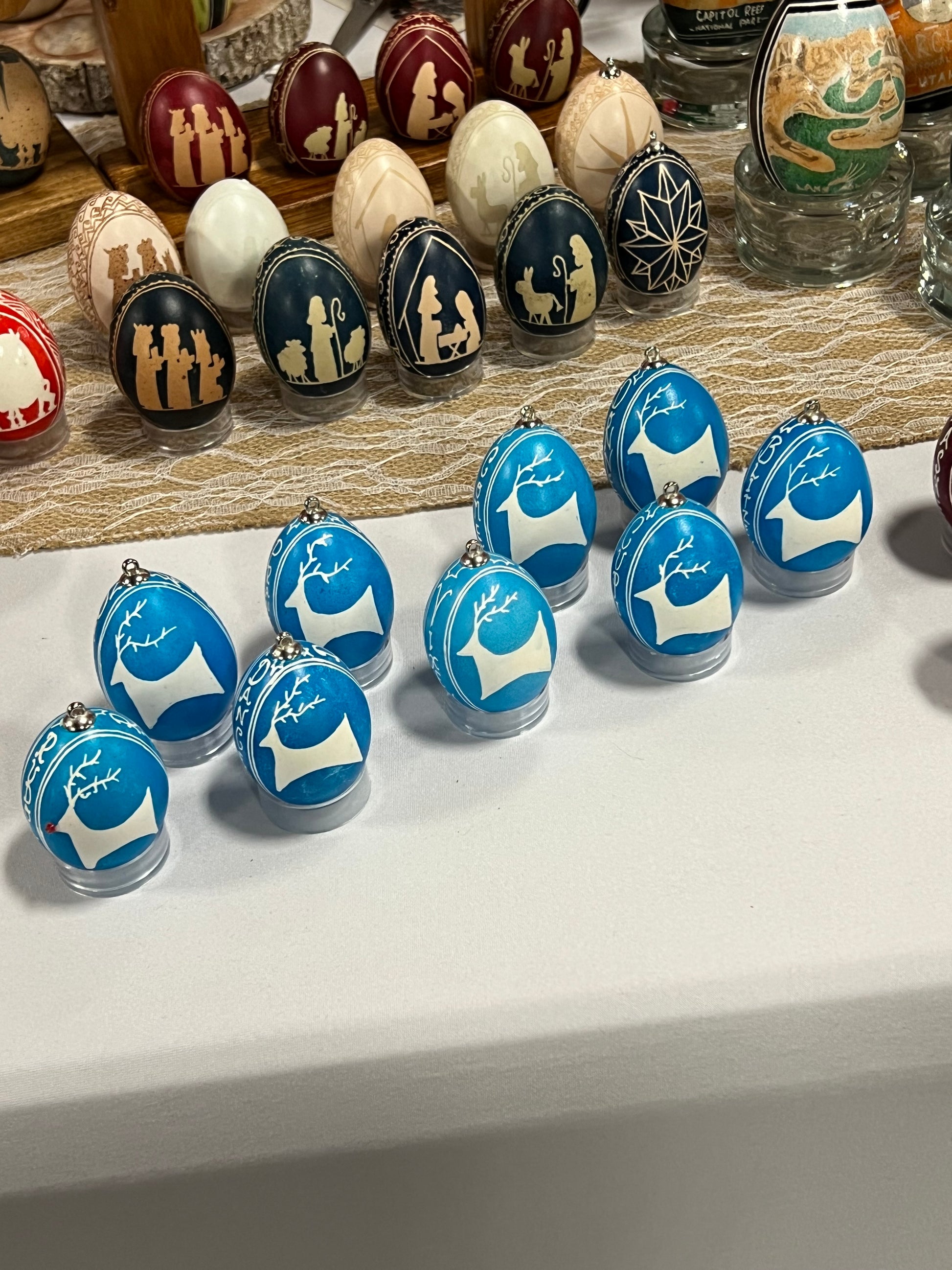 An adorable Christmas set made of 9 small eggs with an image of a reindeer on each plus the name of each of Santa's reindeer on the center band. Rudolph leads the team with a cute little red bead nose.