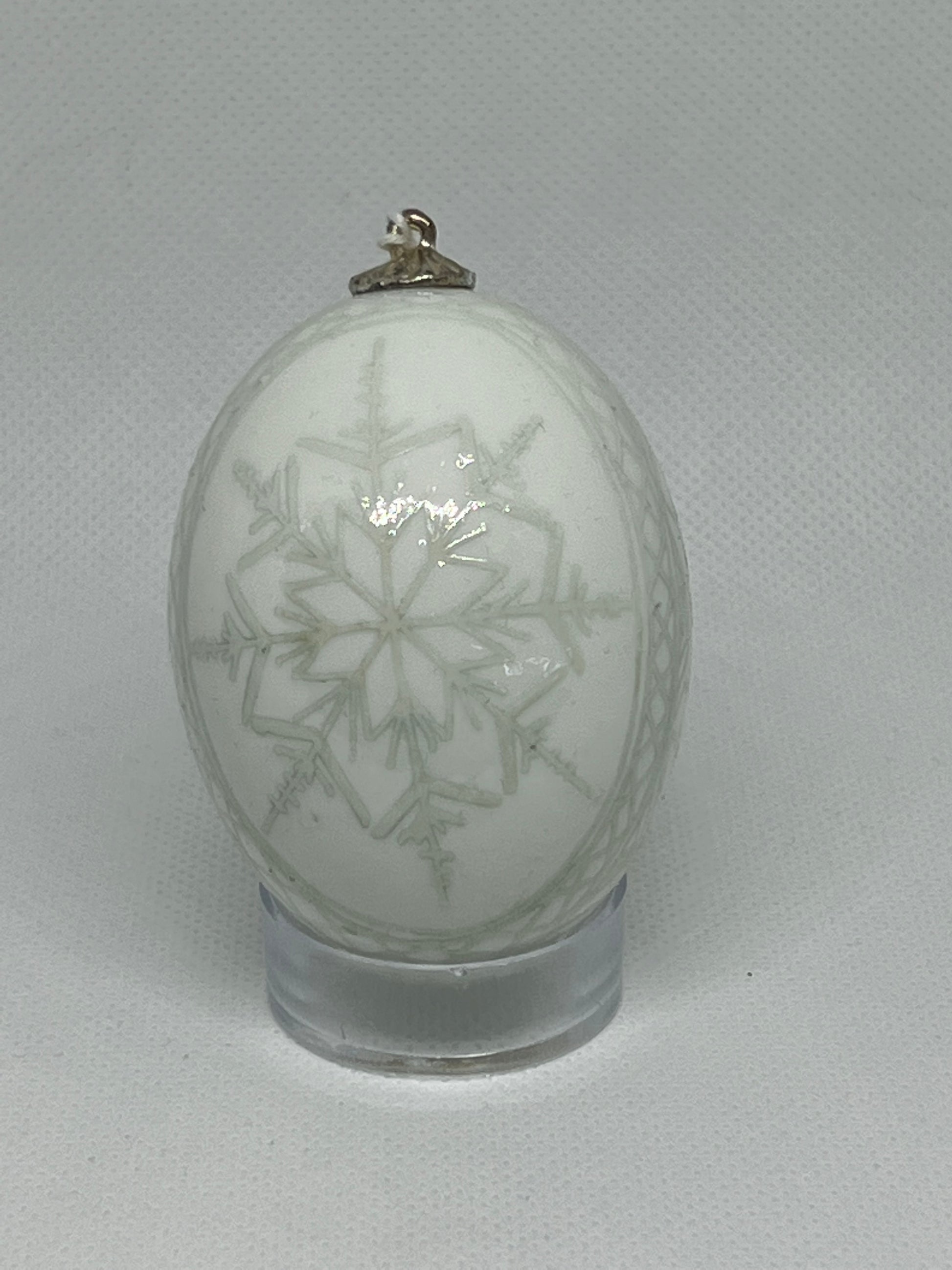 Green duck egg with a detailed snowflake design etched into the egg rather than using a dye so the natural color of the egg is on display.