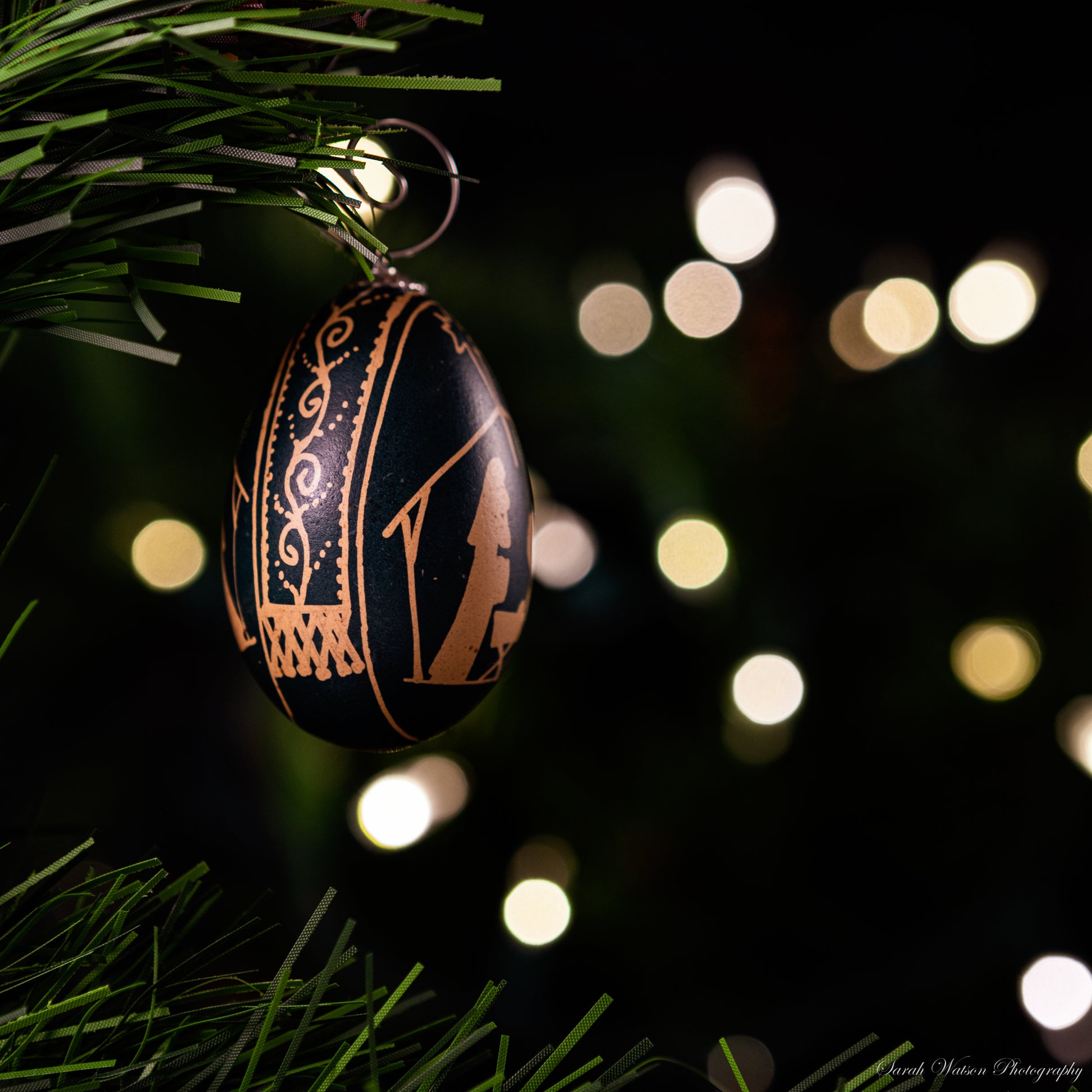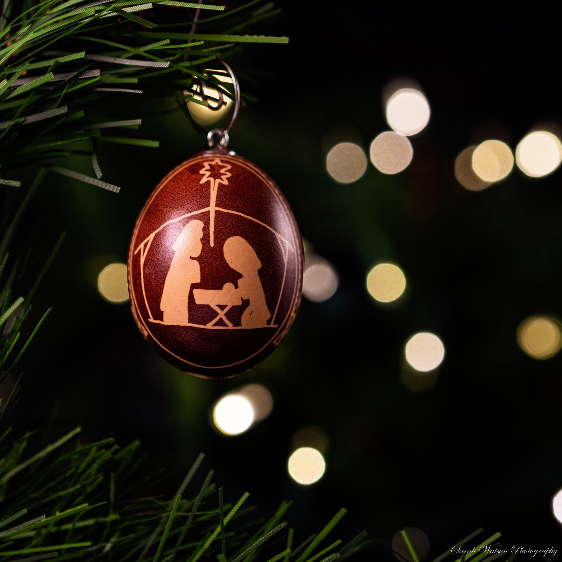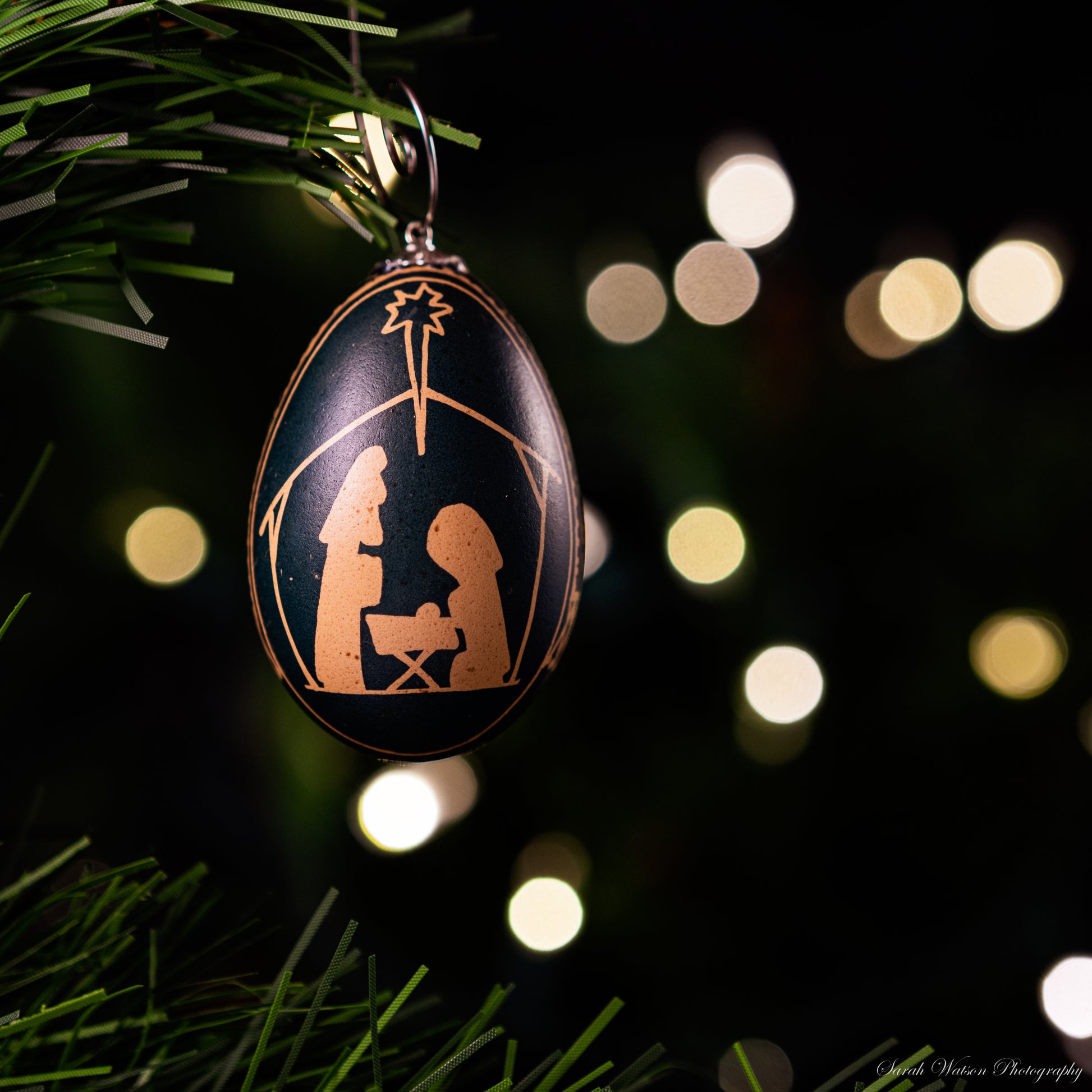 Manger scene with Jesus, Mary and Joseph in stable with Star above. Intricate band design around center of egg.