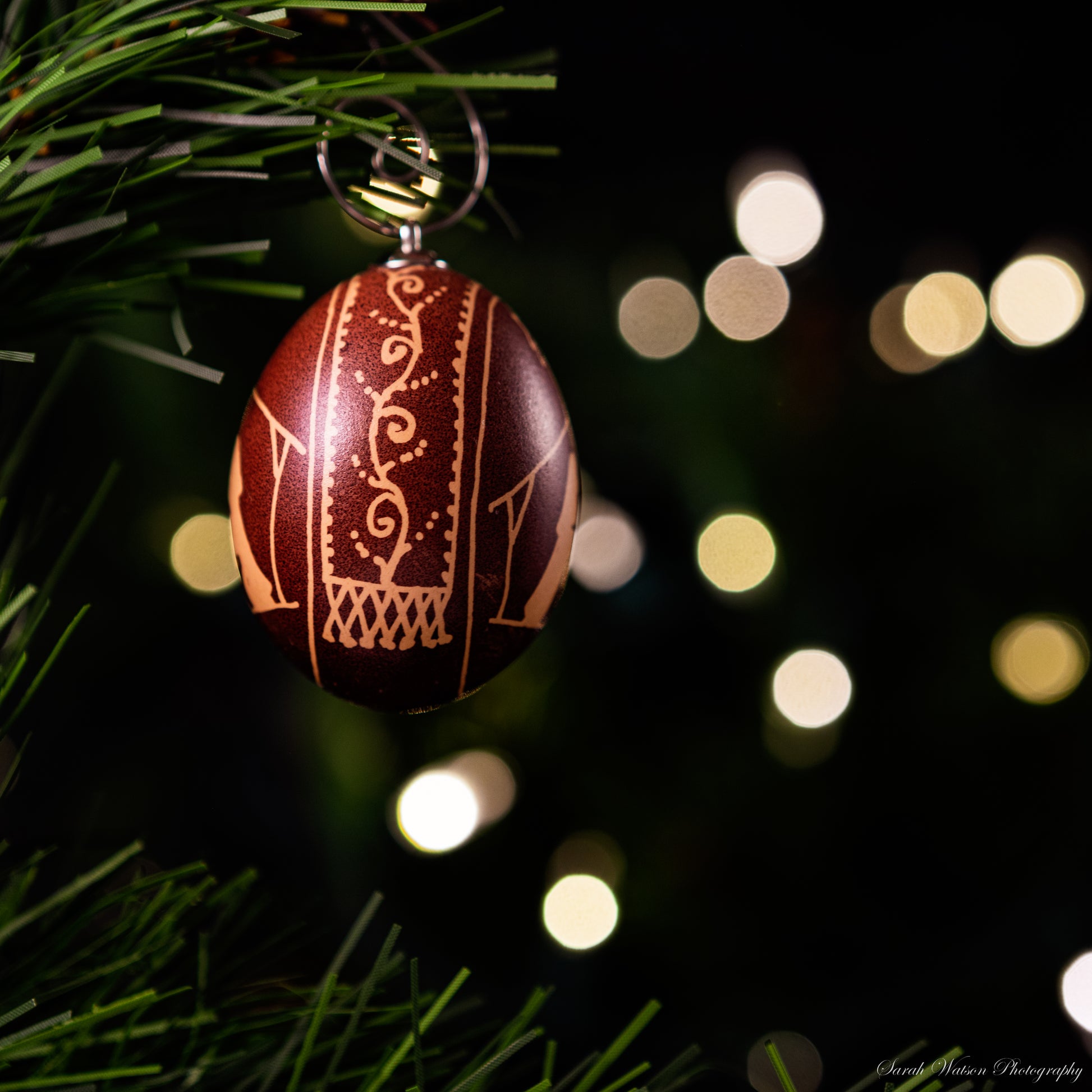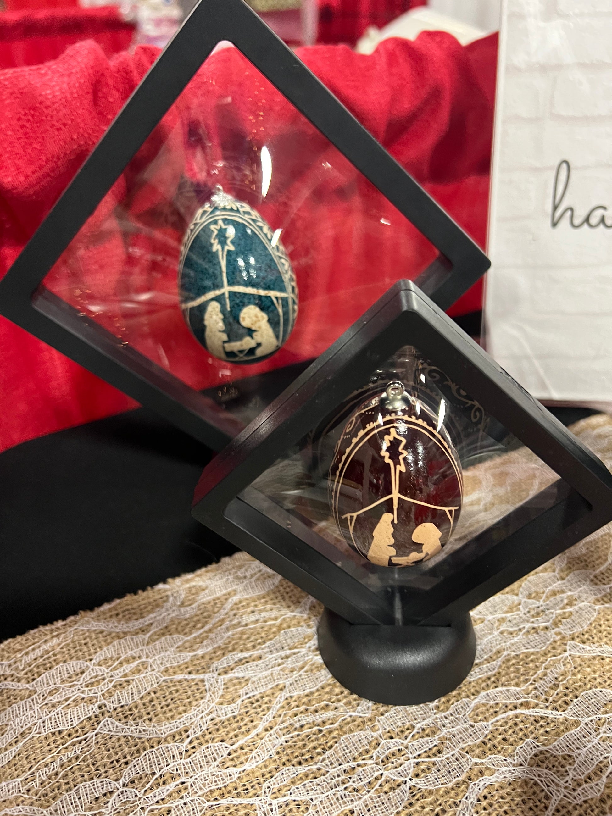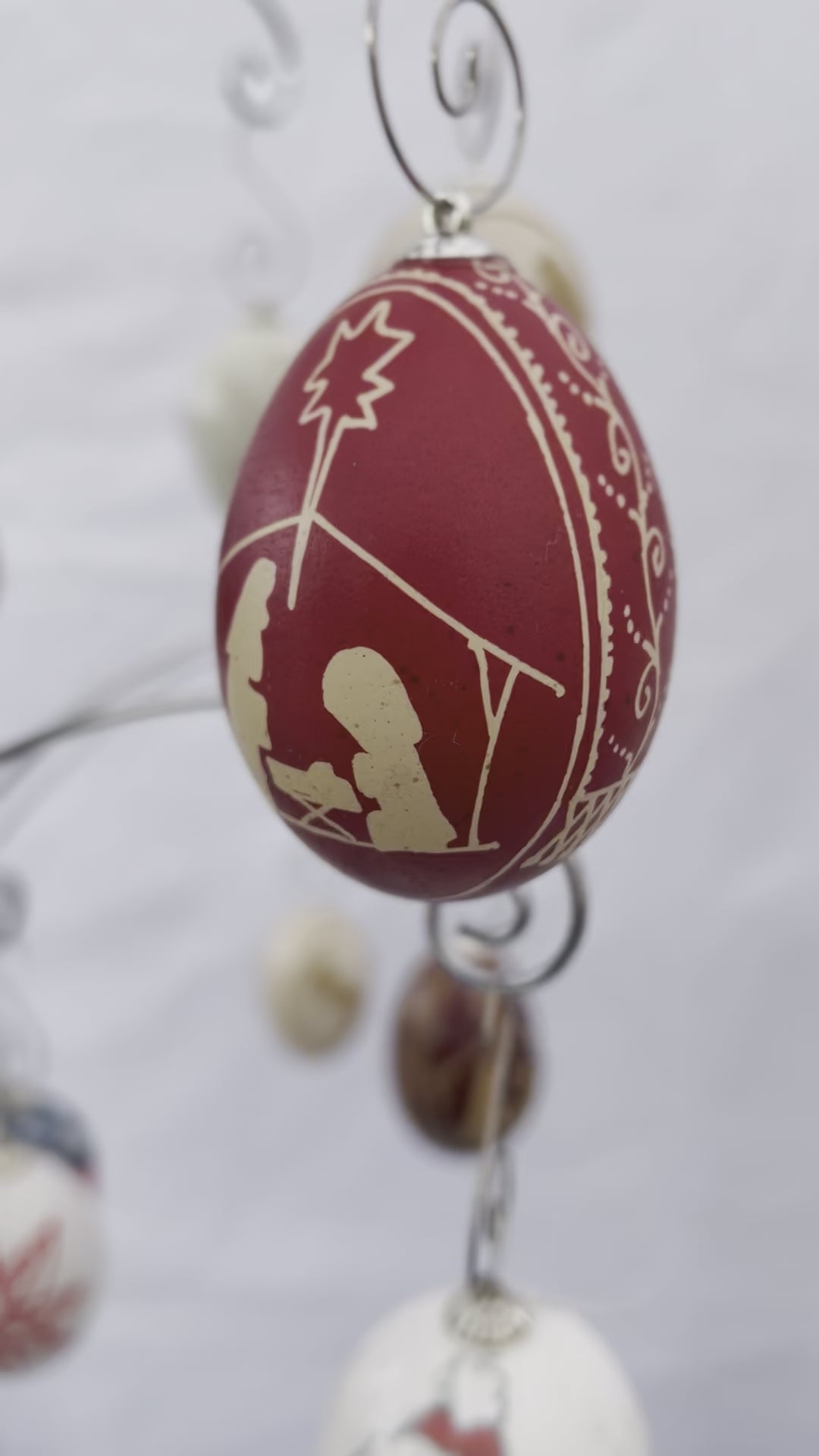 Single ornament made from white or brown chicken eggs in a variety of colors.